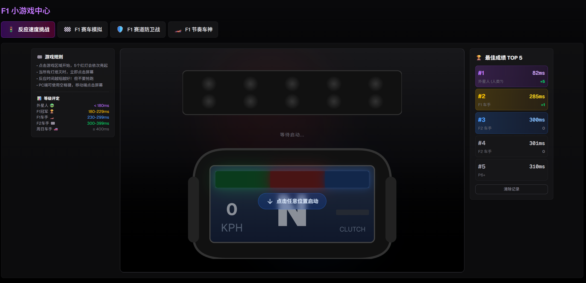 基础赛事信息和F1知识库 · 包含小游戏中心、入门玩法等体验功能。